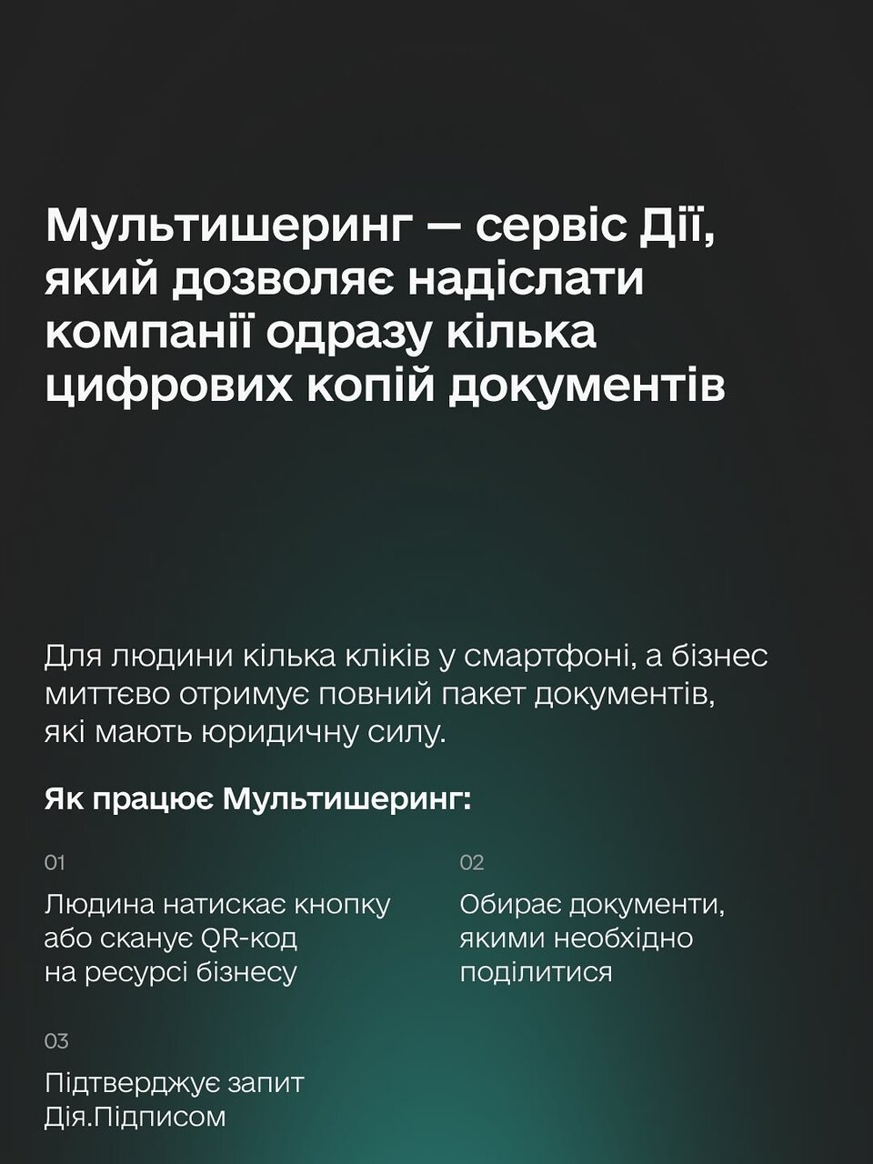 - За допомогою мультишерінгу українці можуть миттєво надсилати свої документи без необхідності носити стоси паперів або оцифровувати їх через фото чи сканування.