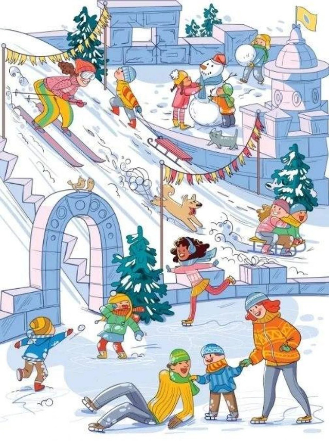 На малюнку вище видно ковзанку, на якій катаються дорослі й діти. Позаду неї відбуваються інші зимові розваги.