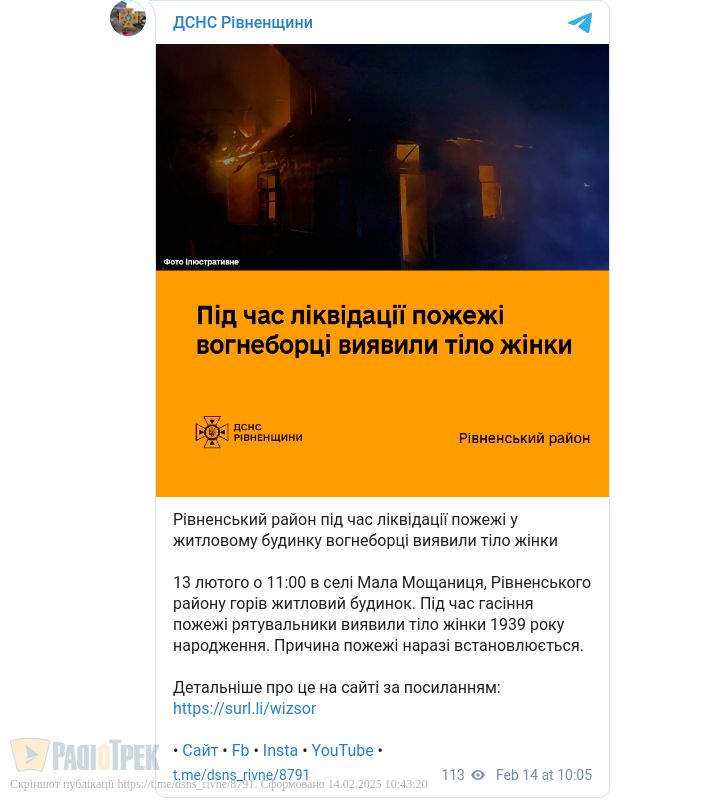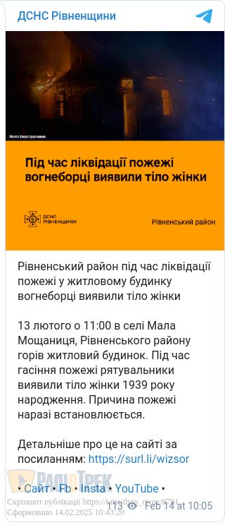 Тіло жінки виявили рятувальники під час ліквідації пожежі на Рівненщині. Загоряння сталося вчора в селі Мала Мощаниця, що неподалік Здолбунова.