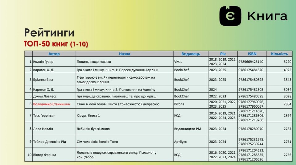 - Володимира Станчишина – 4692 примірники,