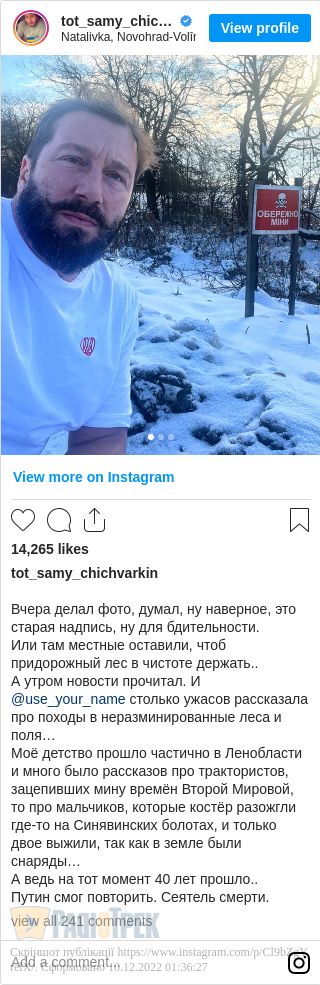 Дорогою назад Чичваркін зупинився в селі Наталівка, що неподалік Звягеля (раніше Новоград-Волинський) і зробив фото на фоні знака «Обережно, міни».