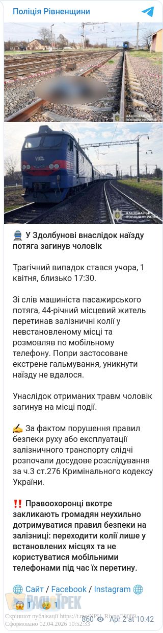 За словами машиніста, 44-річний місцевий житель переходив колії у невстановленому місці та розмовляв по телефону.