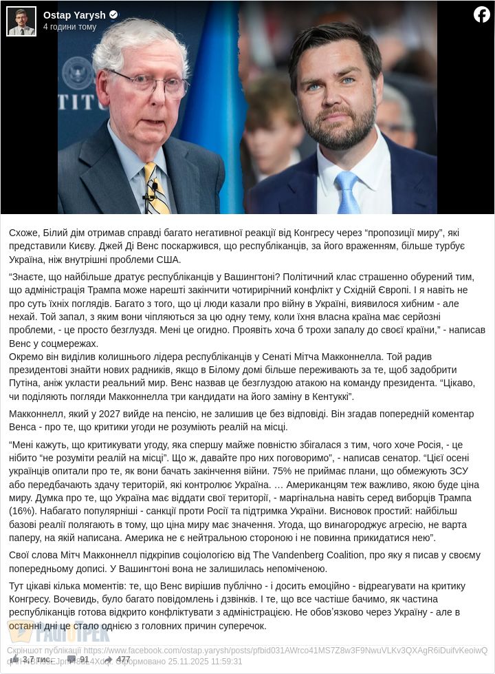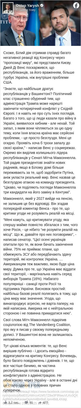 Тут цікаві кілька моментів: те, що Венс вирішив публічно – і досить емоційно – відреагувати на критику Конгресу.