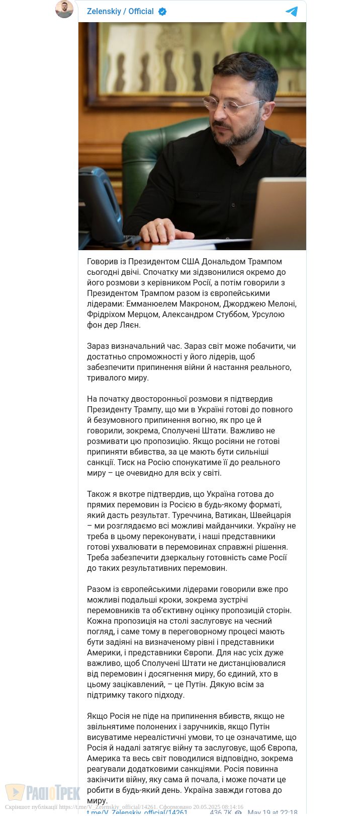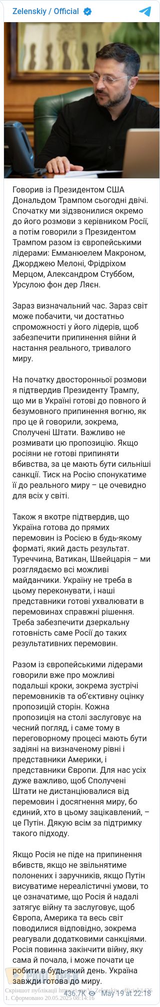 «Росія та Україна негайно розпочнуть переговори щодо припинення вогню і, що найголовніше, завершення війни,» - написав Трамп у Truth Social.
