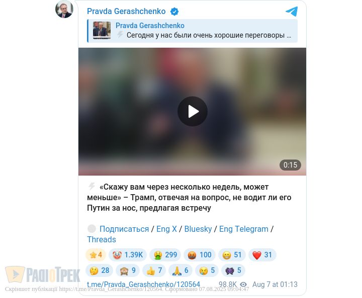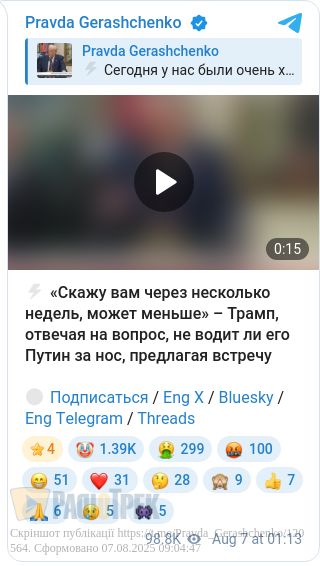 Приміром, він запевняє, що зустріч його спецпосланця Віткоффа з Путіним в Кремлі пройшла «дуже добре», але каже, що не може назвати її «проривом».