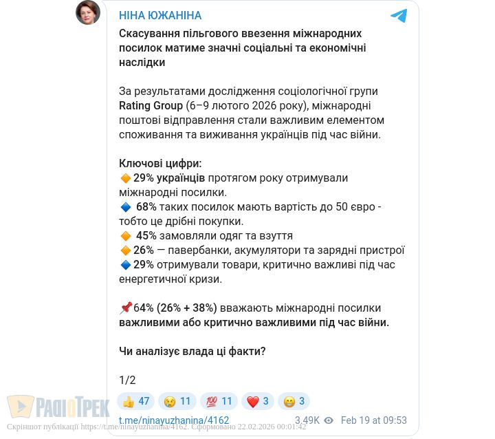 Ідея запровадити ПДВ 20% на міжнародні посилки невеликої вартості може мати масштабні наслідки для економіки та волонтерського руху. Про це заявила народна депутатка Ніна Южаніна, оприлюднивши результати дослідження соціологічної групи Rating Group (6–9 лютого 2026 року), пише Мінфін.
