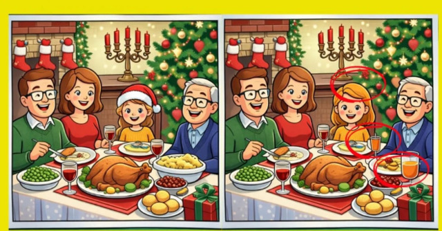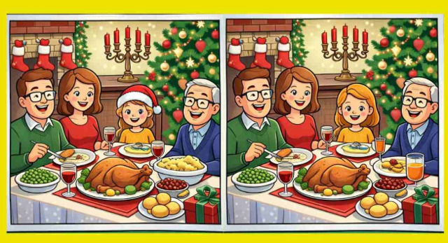 На картинці вище – два зображення різдвяної сімейної вечері. На перший погляд, вони здаються абсолютно однаковими, проте між ними заховали три дрібні відмінності.