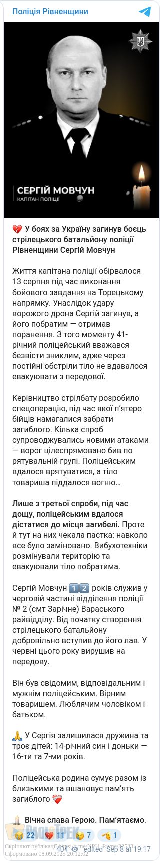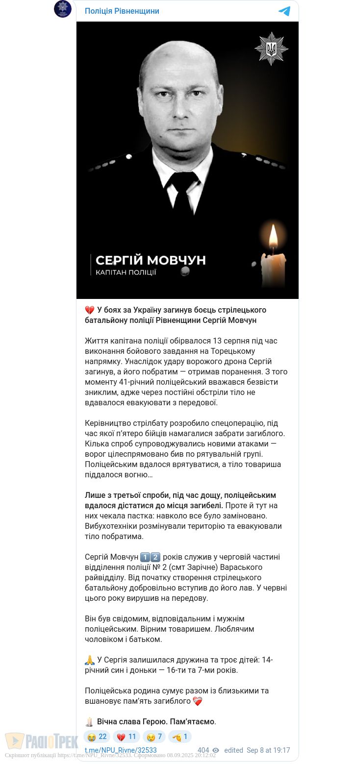 Капітан поліції Рівненщини Сергій Мовчун загинув у боях за Україну.