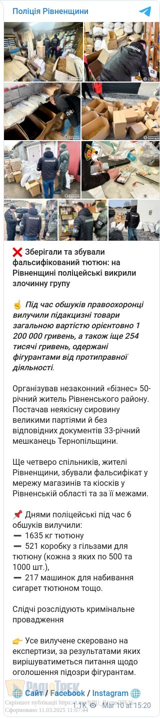 Загалом під час обшуків вилучили понад півтори тонни тютюну, тисячі гільз, машинки для набивання сигарет та гроші. Усім фігурантам оголошено підозру, їм загрожує до семи років за ґратами.