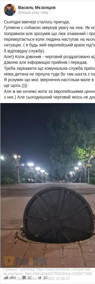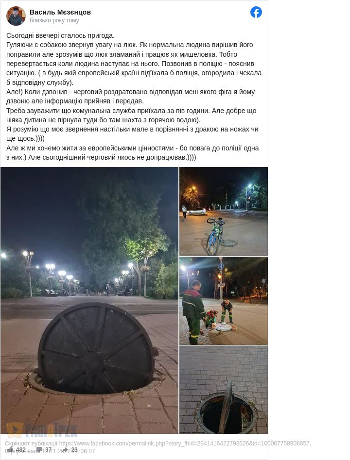 Гуляючи с собакою звернув увагу на люк. Як нормальна людина вирішив його поправили, але зрозумів що люк зламаний і працює як мишоловка. Тобто перевертається коли людина наступає на нього. Подзвонив в поліцію - пояснив ситуацію. (в будь-якій європейській країні під'їхала б поліція, огородила і чекала б відповідну службу).