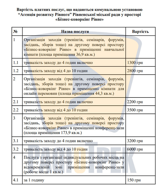 У «Бізнес-коворкінгу Рівне» на Поштовій, 2 будуть платні послуги. У проєкті рішення йдеться, що комунальна установа «Агенція розвитку Рівного» надаватиме в оренду приміщення для проведення тренінгів, семінарів, конференцій тощо.