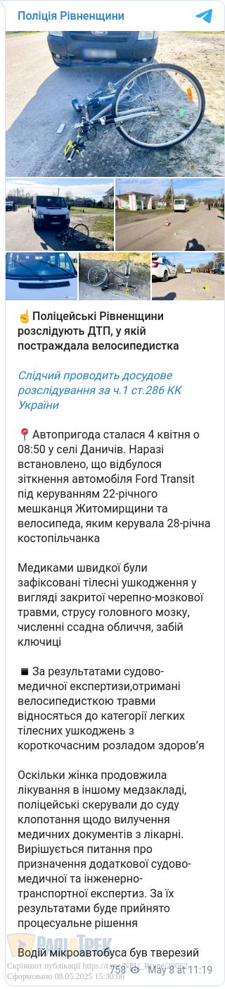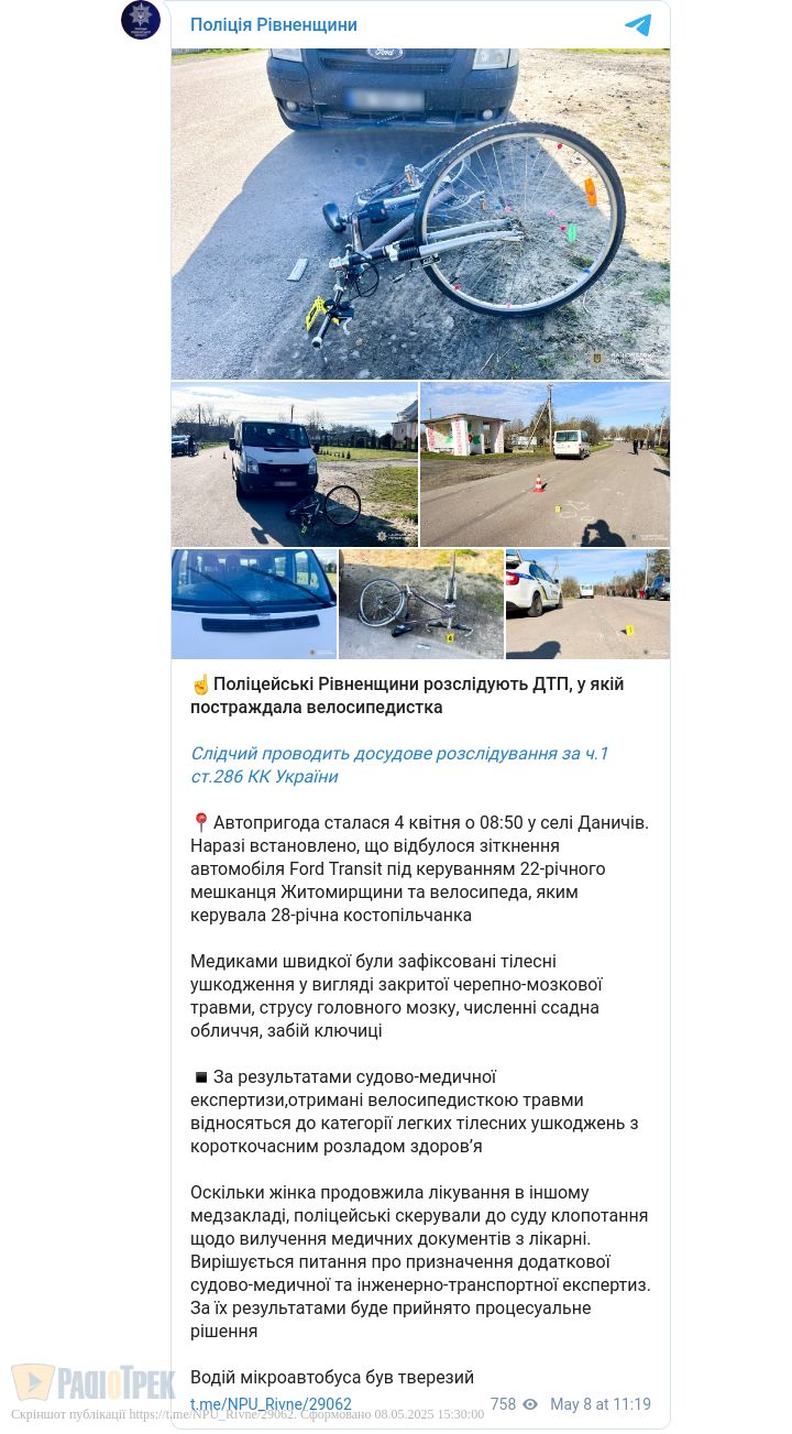 У поліції Рівненщини повідомили, що за результатами судово-медичної експертизи, отримані велосипедисткою травми відносять до категорії легких тілесних ушкоджень з короткочасним розладом здоров’я.