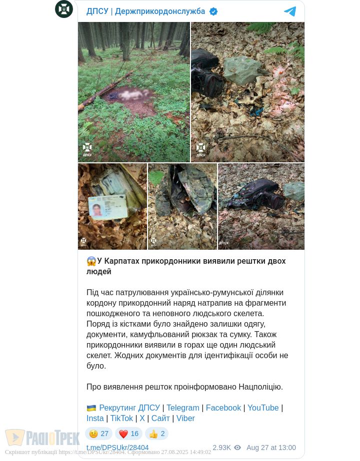 Поряд із кістками знайшли залишки одягу, документи, камуфльований рюкзак та сумку. Також прикордонники виявили в горах ще один людський скелет. Втім, жодних документів для ідентифікації особи не було.