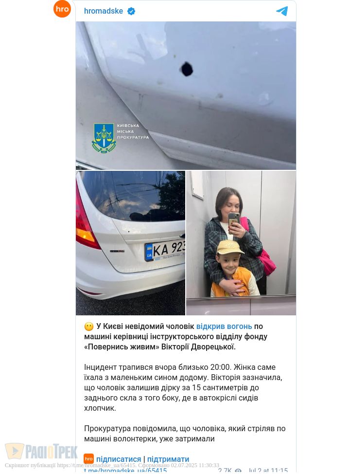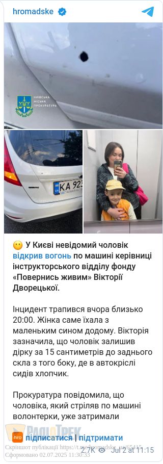 У Києві велосипедист відкрив стрілянину по авто волонтерки. 46-річний чоловік відкрив вогонь з пістолета по автомобілю, у якому перебувала волонтерка Вікторія Дворецька із сином через те, що його начебто забризкала з калюжі інша машина.
