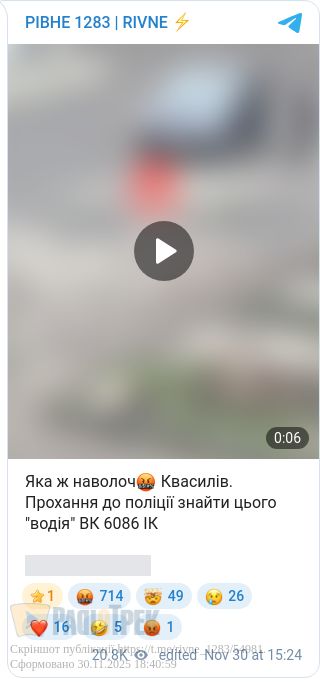 Сьогодні, 30 листопада, під час моніторингу соціальних мереж в одному з телеграм-каналів правоохоронці виявили відео, у якому невідомий на автомобілі, здійснив наїзд на собаку, повідомляють в ГУНП Рівненської області.