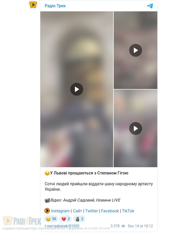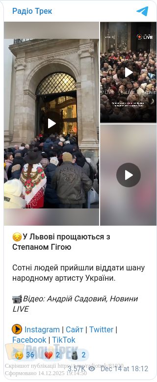 У Львові сотні людей прийшли віддати шану народному артисту України Степану Гізі. Церемонія відбувається у Гарнізонному храмі святих апостолів Петра і Павла. Про початок прощання повідомив Львівський міський голова Андрій Садовий.