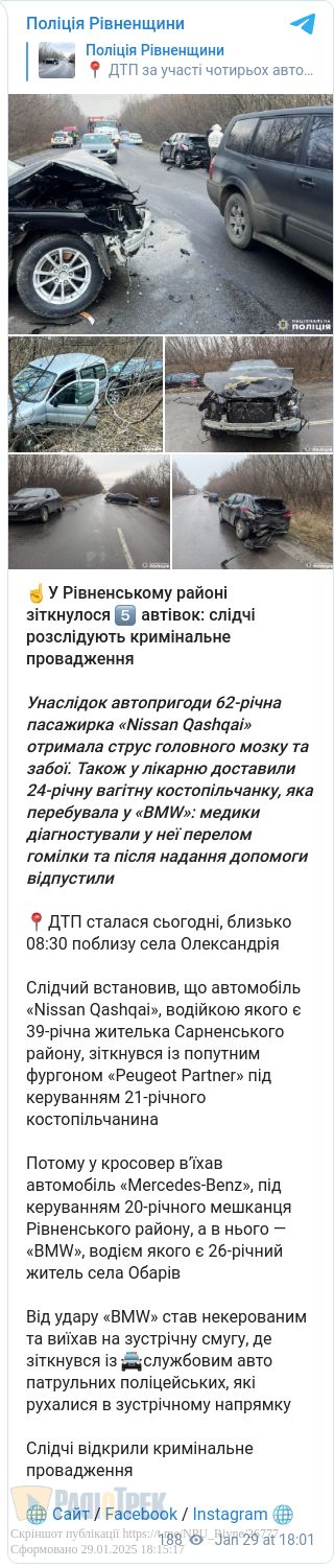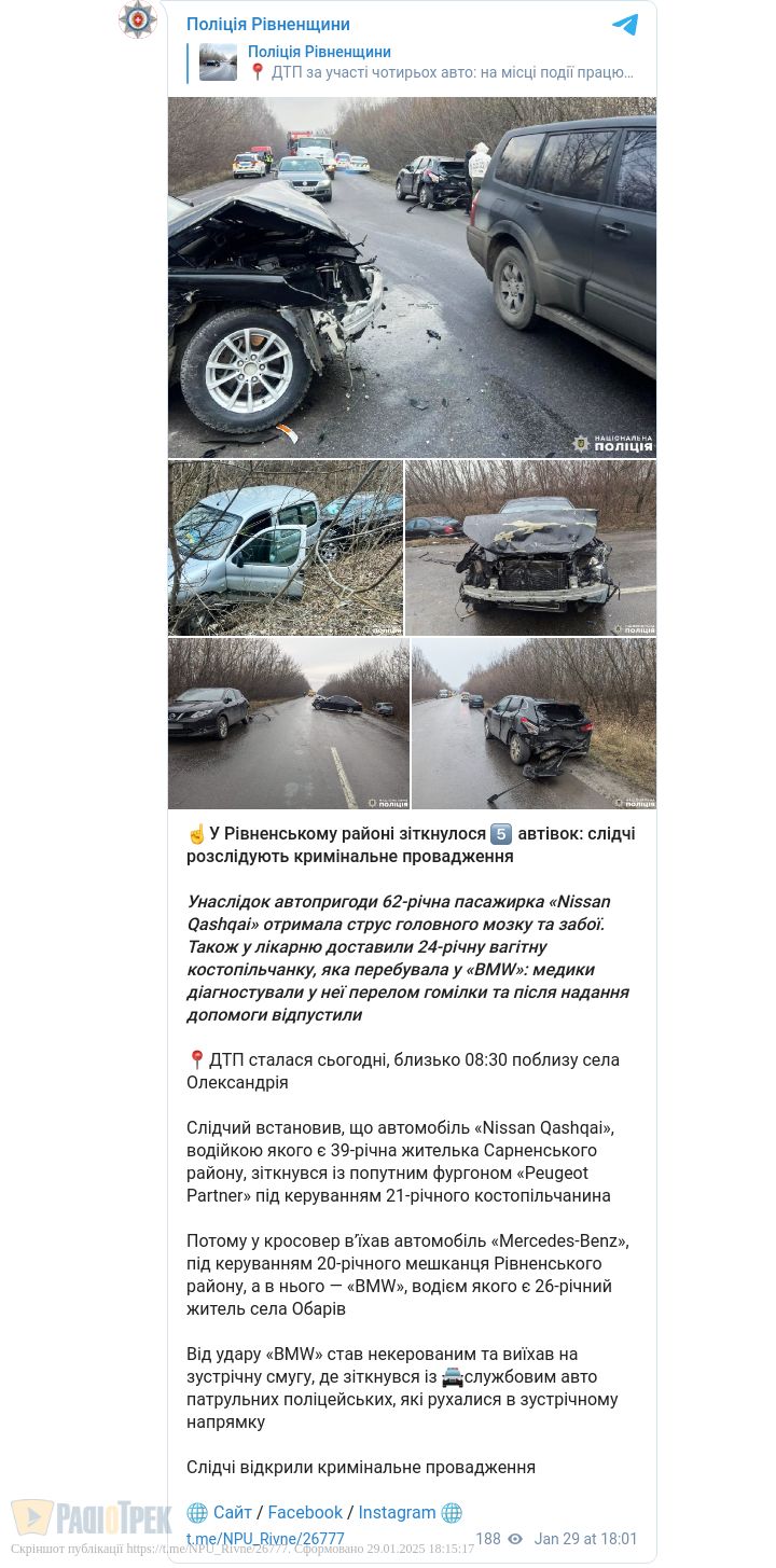 Після цього у кросовер в’їхав автомобіль Mercedes-Benz, під керуванням 20-річного мешканця Рівненського району, а в нього — BMW, водієм якого є 26-річний житель села Обарів. Від удару BMW став некерованим та виїхав на зустрічну смугу, де зіткнувся із службовим авто патрульних.