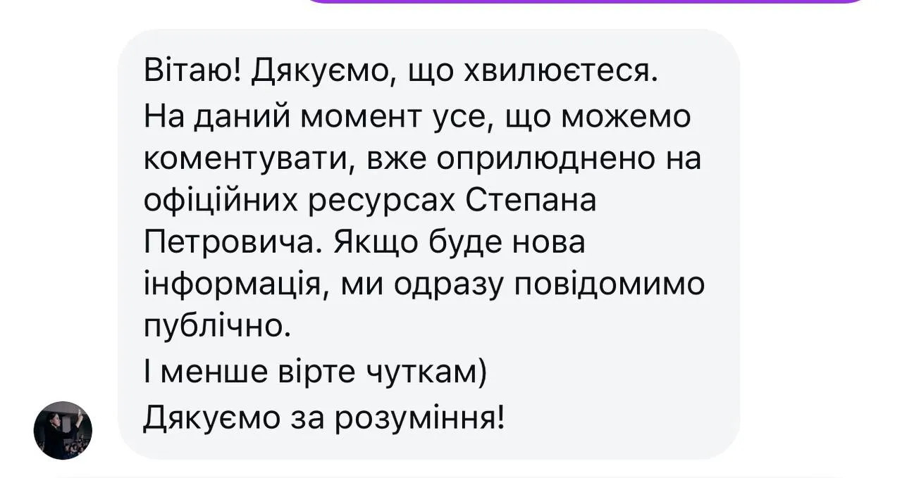 - На цей час усе, що можемо коментувати, вже оприлюднено на офіційних ресурсах Степана Петровича. Якщо буде нова інформація, одразу повідомимо публічно. І менше вірте чуткам, — йдеться у повідомленні.