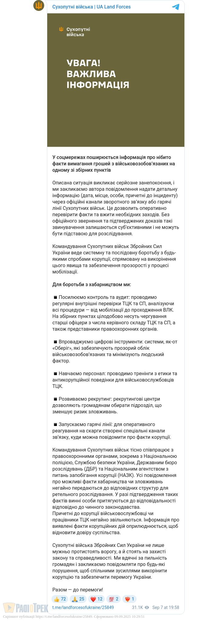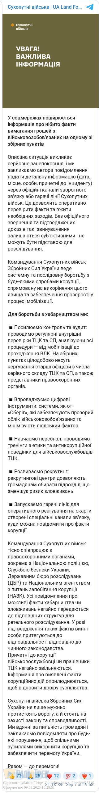 Командування Сухопутних військ наголошує, що веде системну боротьбу з будь-якими спробами корупції та забезпечує прозорість процесу мобілізації.