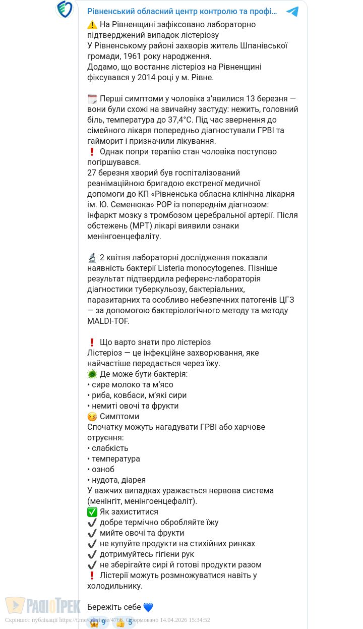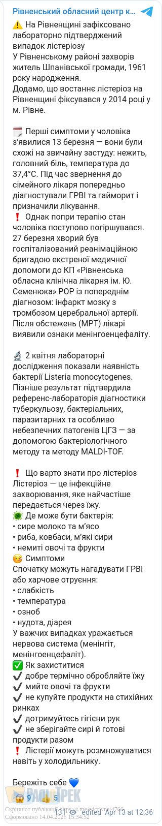Уперше за 12 років на Рівненщині зафіксували випадок лістеріозу. Захворів житель Шпанівської громади. Спершу симптоми були схожі на застуду, однак стан чоловіка погіршився і його госпіталізували.
