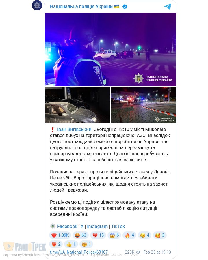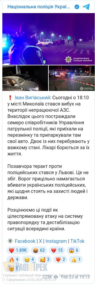 Постраждали 7 співробітників патрульної поліції, які приїхали на перезмінку та припаркували там свої авто, – Вигівський.