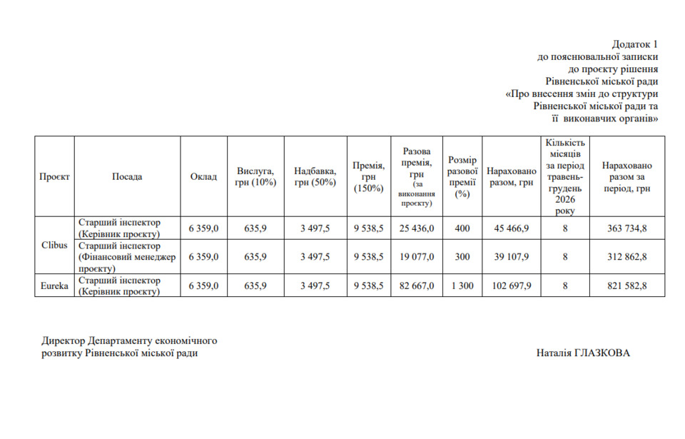 Витрати на зарплати новим працівникам з травня по грудень 2026 року становитимуть майже 700 тис грн по CLIBUS і понад 800 тис грн по EUREKA.
