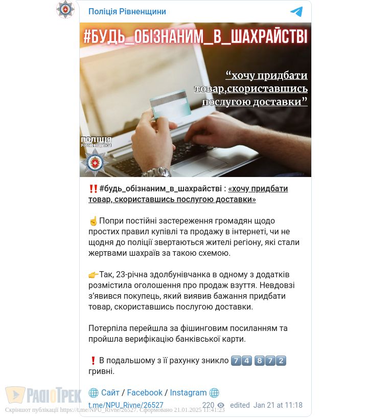 У жительки Рівненщини, яка хотіла продати взуття в інтернеті, шахраї вкрали 74 872 грн. На «гачок» аферистів попалася 23-річна жителька Здолбунова.