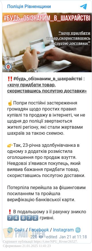 Перейшовши за фішинговим посиланням потерпіла пройшла верифікацію банківської карти, після чого з її рахунку зникли всі гроші.