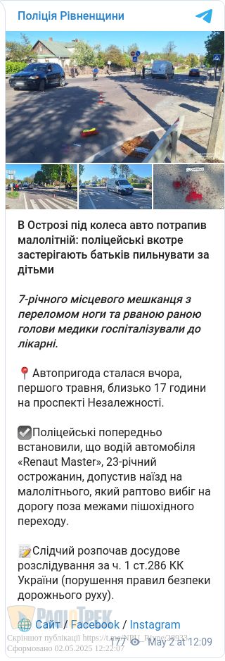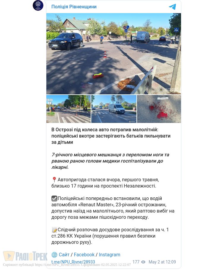 Аварія сталася напередодні ввечері в Острозі. Близько 17 години на проспекті Незалежності 23-річний водій автомобіля Renaut Master наїхав на хлопчика, який раптово вибіг на дорогу поза «зеброю», повідомили у відділі комунікації поліції Рівненщини.