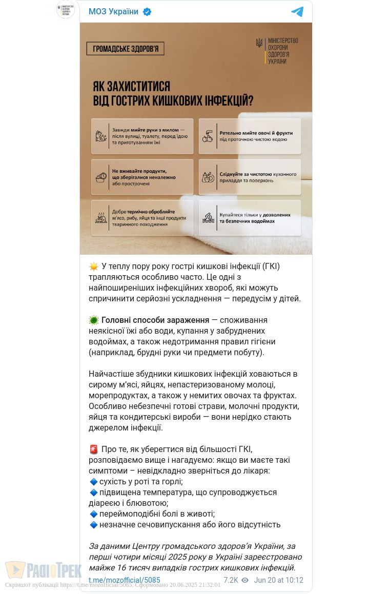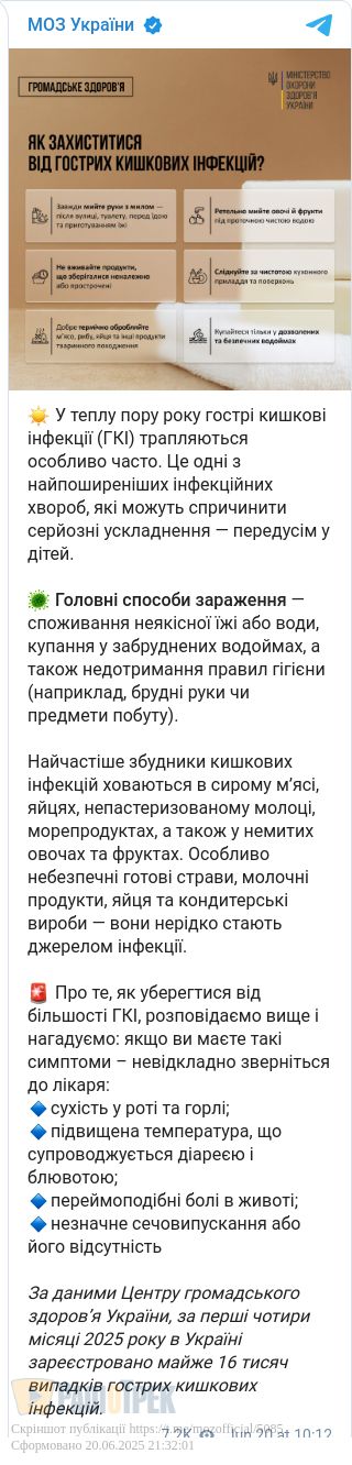 Україна стрімко входить у сезон підвищеного ризику зараження гострими кишковими інфекціями (ГКІ). У Міністерстві охорони здоров’я попереджають: тепла погода, недотримання гігієни та вживання сумнівної їжі — ідеальні умови для швидкого поширення цієї «літньої зарази».