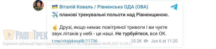 Пів години тому рівнян налякали звуки винищувача. Повітряної тривоги у цей час не було. Голова військадміністрації Віталій Коваль заспокоїв, каже, що це над Рівненщиною проходять планові тренувальні польоти нашої авіації.