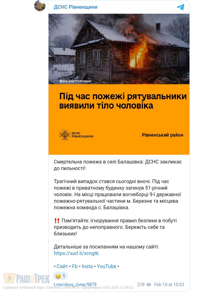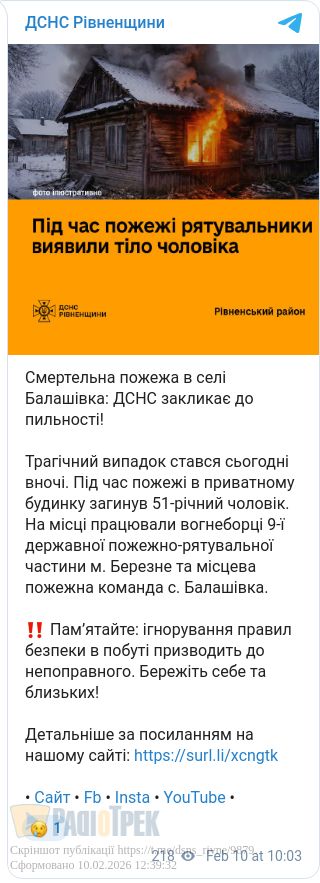 Чоловік загинув унаслідок пожежі на Рівненщині. Трагедія сталася напередодні у селі Балашівка, де загорівся житловий будинок.