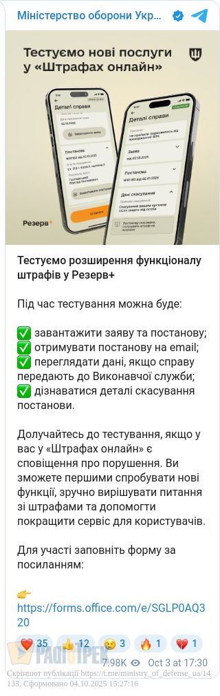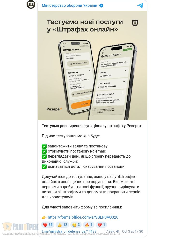 У застосунку «Резерв» розпочали тестування нових послуг. Вони стосуються роботи зі штрафами.