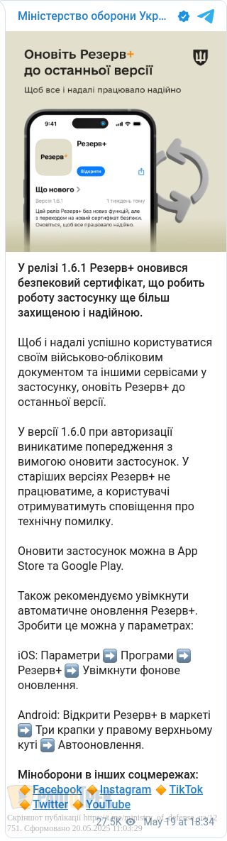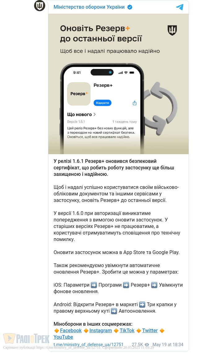 Щоб і надалі успішно користуватися своїм військово-обліковим документом та іншими сервісами у застосунку, необхідно оновити «Резерв+» до останньої версії. У «Резерв+» оновився безпековий сертифікат, що робить роботу застосунку ще більш захищеною і надійною, повідомляє Міністерство оборони.