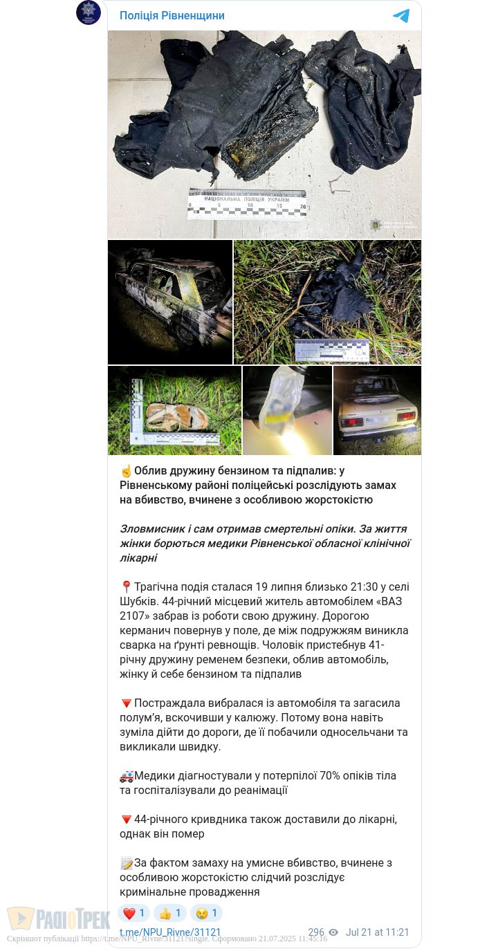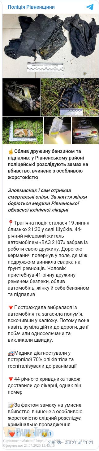 Близько пів на десяту вечора 44-річний чоловік автомобілем ВАЗ 2107 забрав із роботи свою дружину. Дорогою він повернув у поле, де на ґрунті ревнощів між подружжям виникла сварка. Під конфлікту чоловік пристебнув 41-річну дружину ременем безпеки, облив автомобіль, жінку й себе бензином та підпалив.