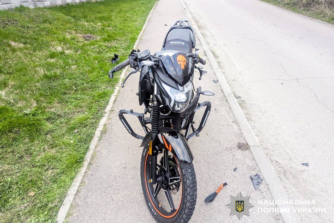 13-річний житель села Городище, керуючи мотоциклом Mustang, під час зустрічного роз’їзду зіткнувся з автомобілем Skoda Fabia, за кермом якого перебував 22-річний житель села Антопіль.