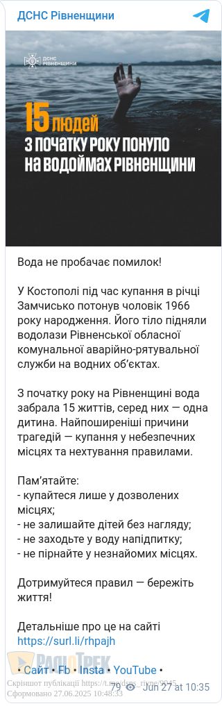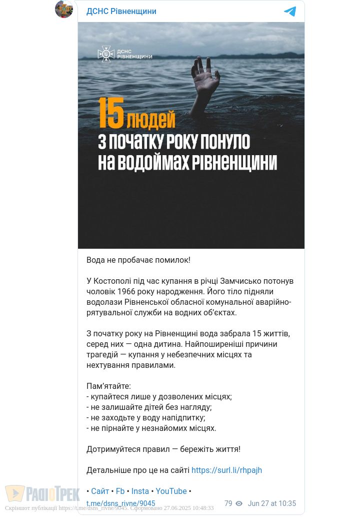 До слова, з початку року на Рівненщині втопилося 15 людей, серед них — одна дитина.