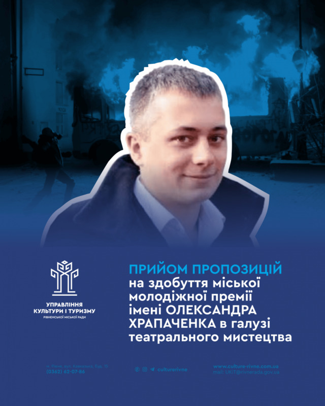 У Рівному розпочали прийом заявок на молодіжну театральну премію імені Олександра Храпаченка. Премію вручають четвертий рік поспіль 18 вересня до дня народження Героя Небесної Сотні, актора і громадського активіста Олександра Храпаченка.