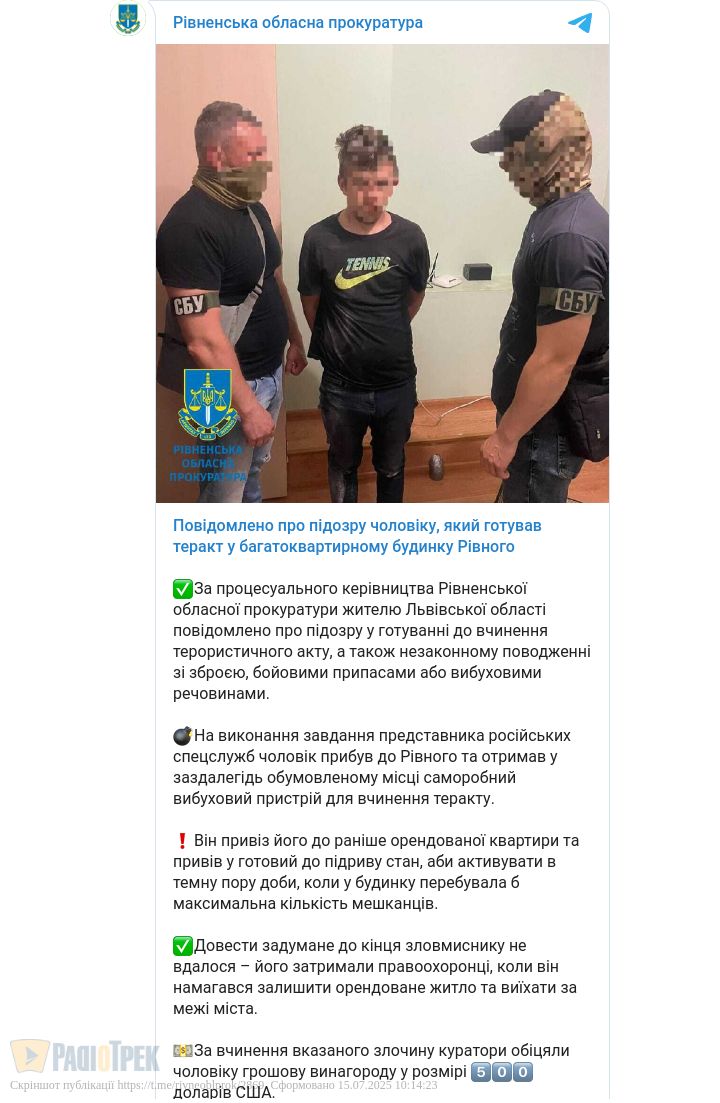 Жителя Львівщини підозрюють у підготовці терористичного акту в рівненській багатоповерхівці.