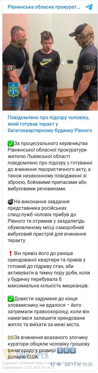 Втім, реалізувати задумане зловмисник не встиг. Правоохоронці затримали його під час спроби втекти з орендованого житла й виїхати з міста. За виконання злочину куратори обіцяли йому 500 доларів США.