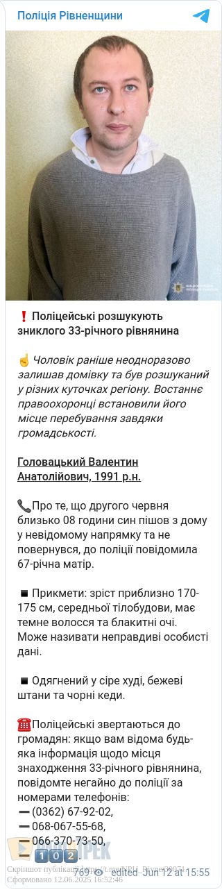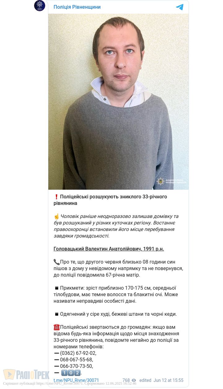 Якщо вам відома будь-яка інформація щодо місця перебування рівнянина, повідомте про це до поліції за номерами телефонів: