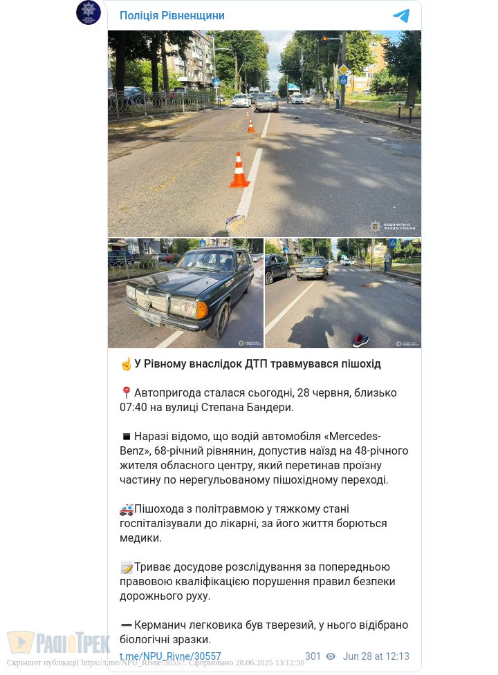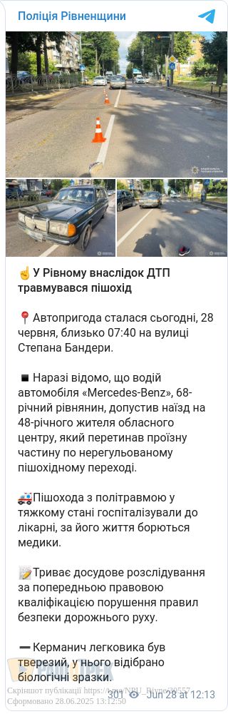 Близько 7:40 на вулиці Степана Бандери 68-річний водій автомобіля Mercedes-Benz наїхав на 48-річного рівнянина, який переходив дорогу по нерегульованому пішохідному переході.