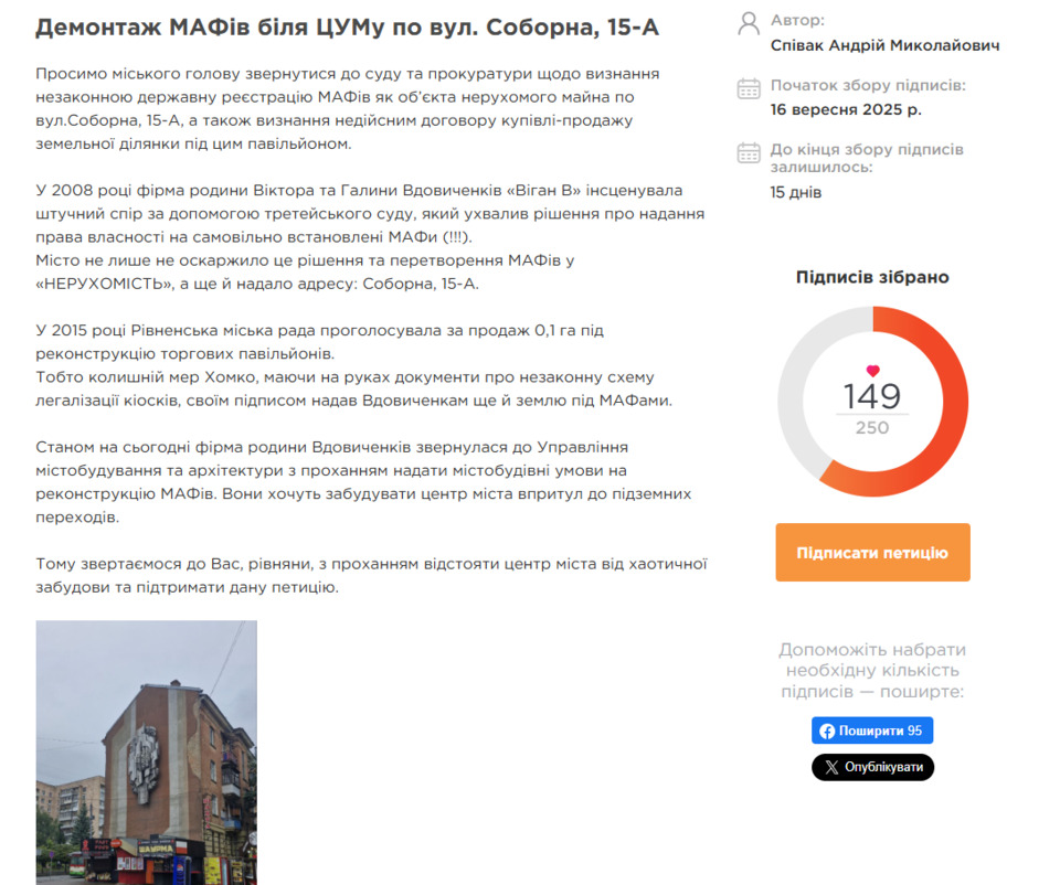 Петицію вже підтримало близько півтори сотні рівнян, до закінчення голосування залишилося 2 тижні.