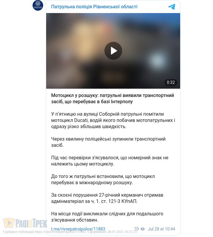 У пʼятницю на вулиці Соборній у Рівному патрульні помітили мотоцикл Ducati, водій якого побачив мотопатрульних і одразу збільшив швидкість. Через хвилину його зупинили.