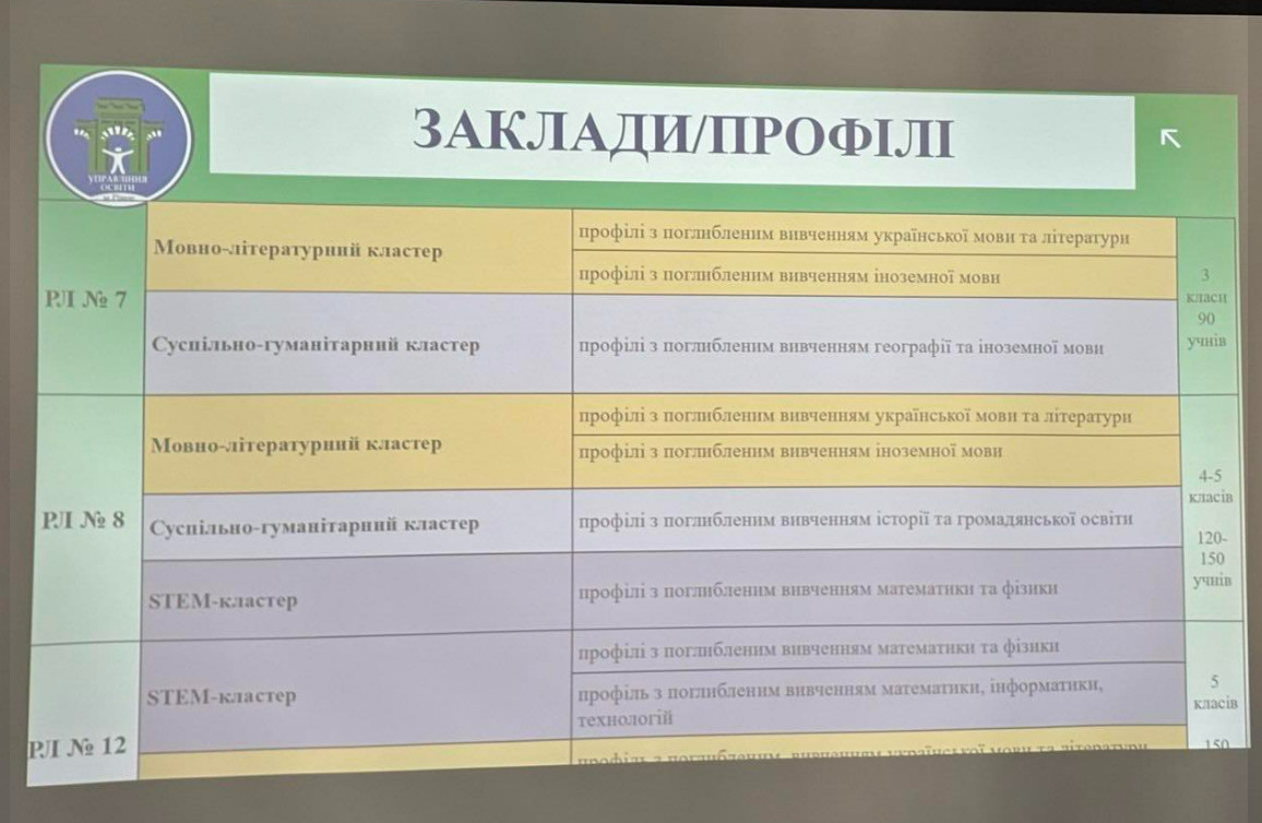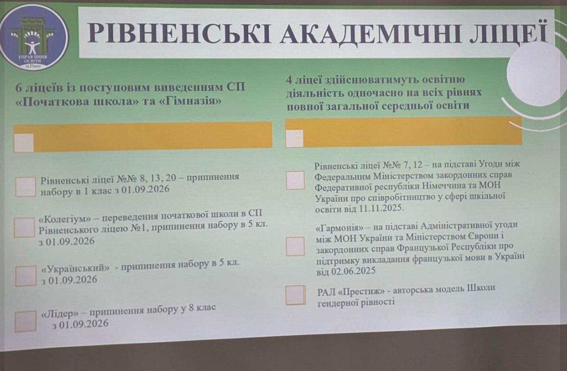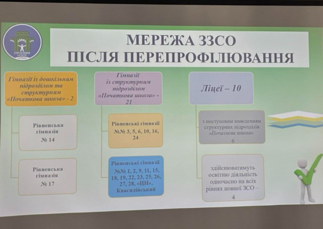 Про це на своїй сторінці у Facebook повідомила депутатка Рівненської міської ради Галина Кульчинська, посилаючись на презентацію управління освіти щодо майбутньої мережі освітніх закладів міста.