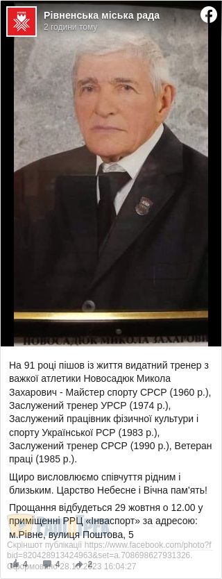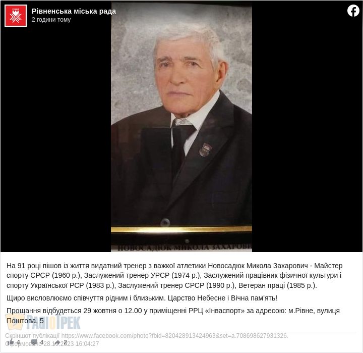 Прощання з померлим відбудеться завтра, 29 жовтня, о 12:00 у приміщенні «Інваспорту», повідомили у Рівнераді.