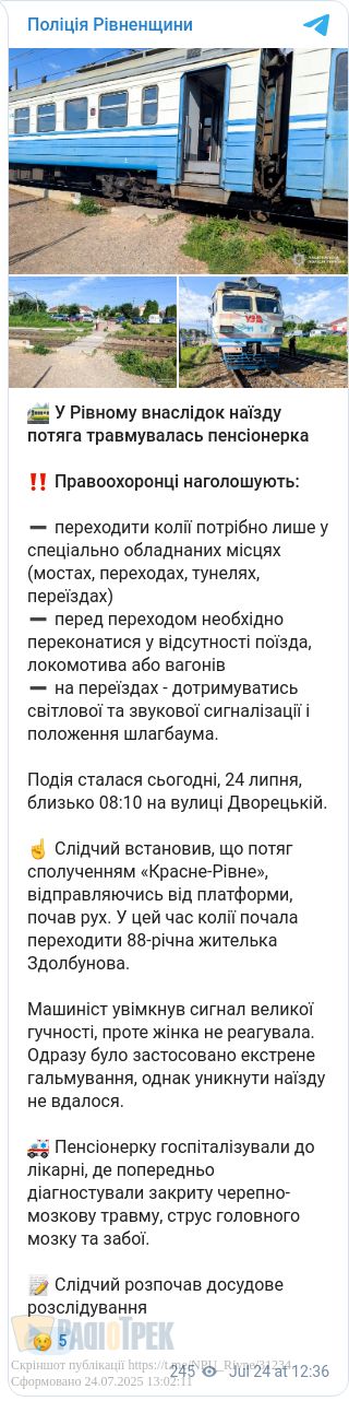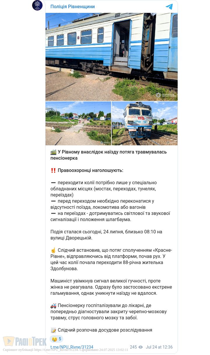 У Рівному потяг наїхав на пенсіонерку (ФОТО)