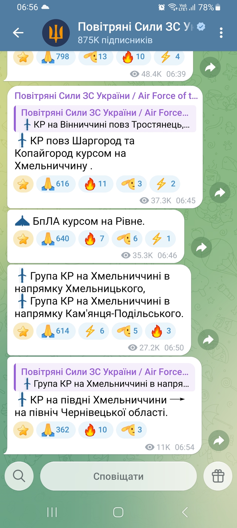 О 7:15 з'явилася інформація, що група крилатих ракет тримає курс на на Рівненщину.