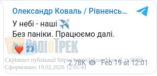 Голова Рівненської ОВА Олександр Коваль написав на своєму телеграмі таке: