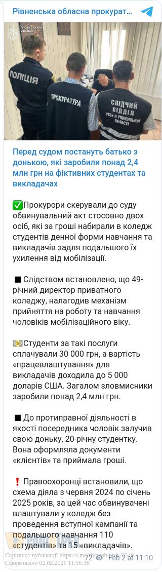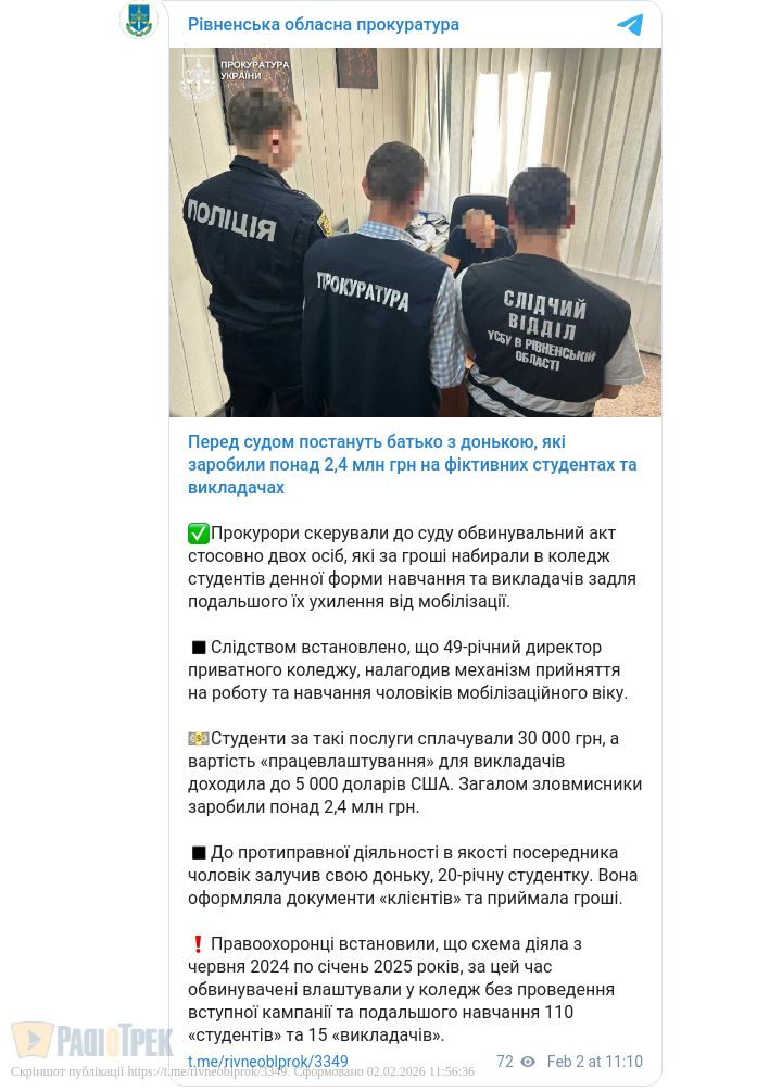 У Рівненській області перед судом постануть директор одного з коледжів та його 20-річна донька. Їх звинувачують в організації схеми ухилення від мобілізації.